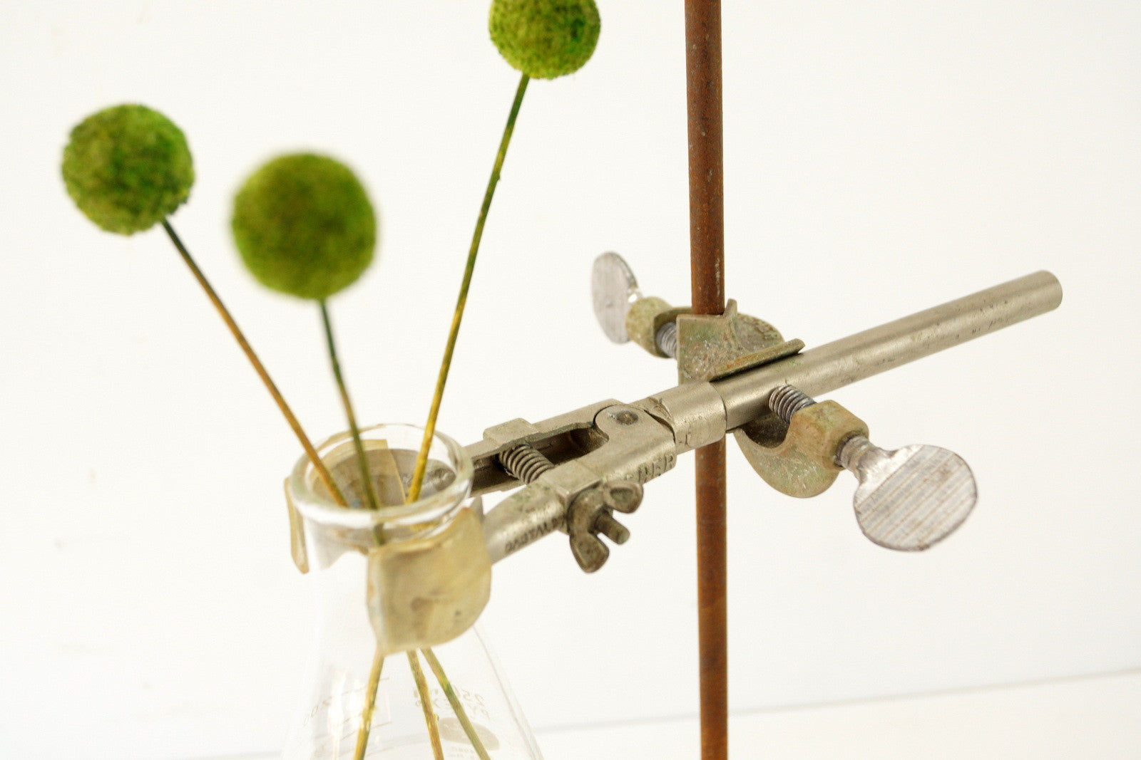 This lab stand features a rustic cast iron base which gives it character. There are two clamps to hold the Erlenmeyer Flask. The clamps can be adjusted to whatever height you would like.