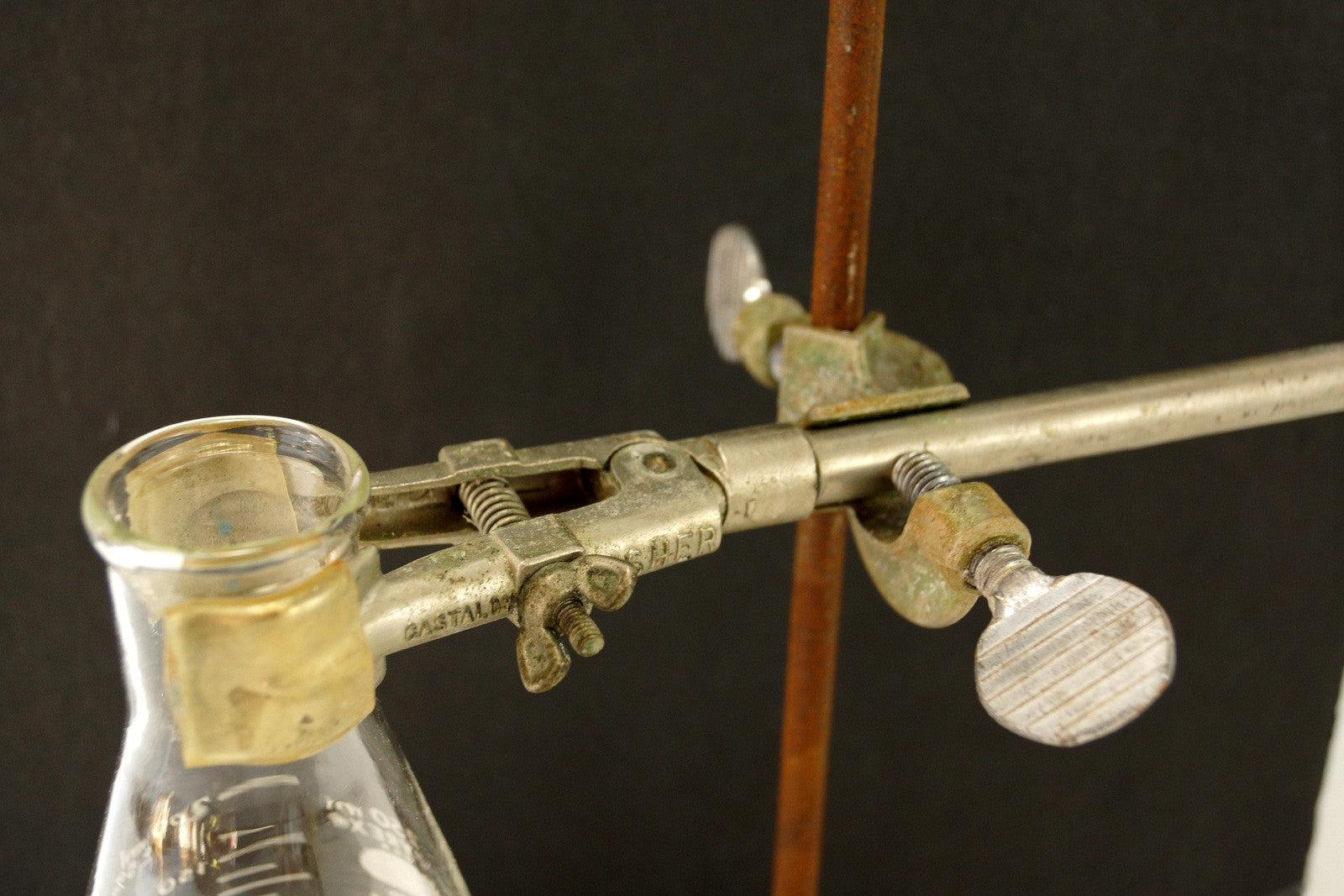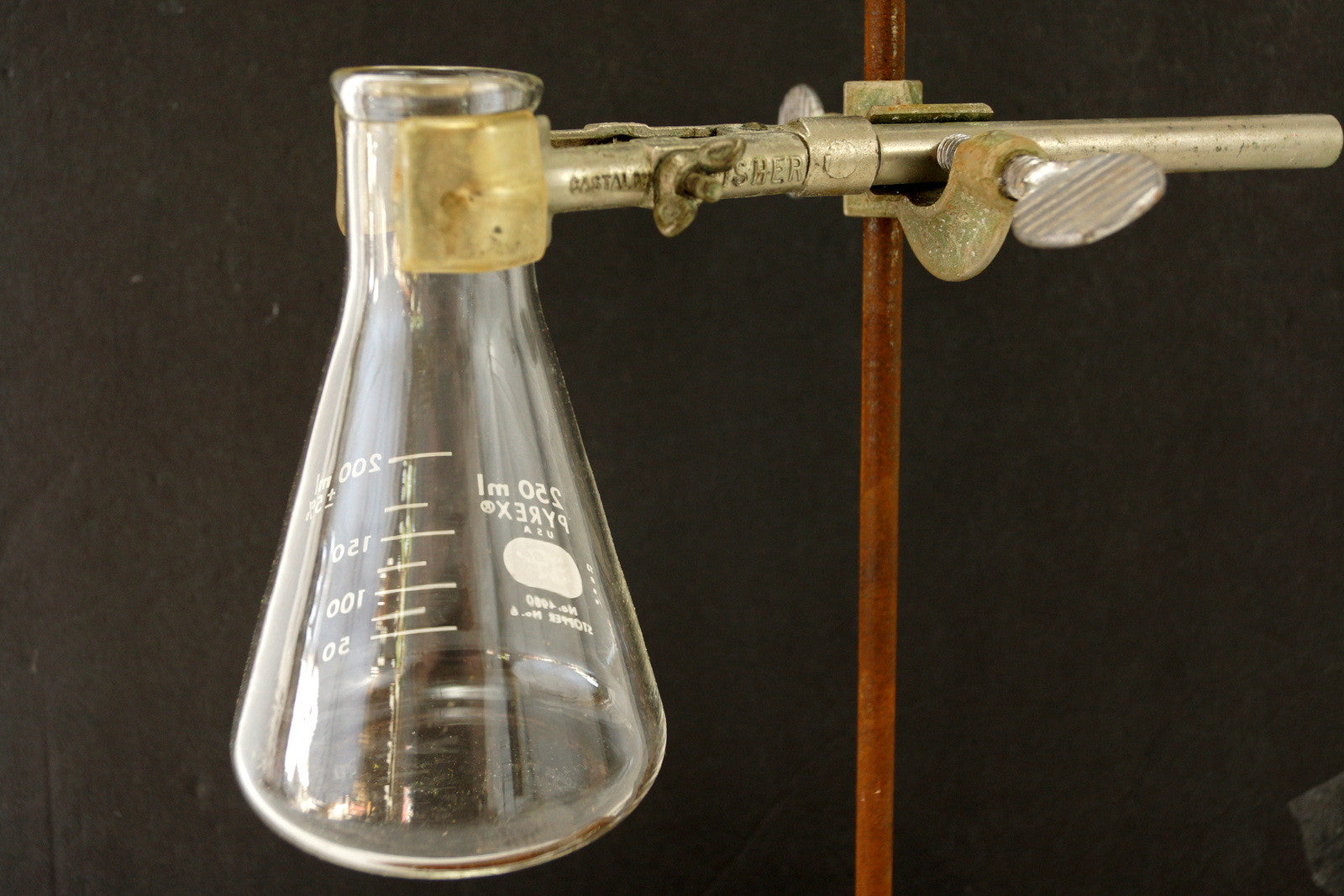 This cast iron stand is in very good vintage condition. The base is is strong and secure with an aged and rustic patina, as shown. The metal rod is straight and has an aged and rusty patina. The metal clamps are strong and secure and the knobs turn with ease. The Erlenmeyer flask is new, old-stock. The flask has some dust in it, but it had been sealed in its original container and is safe for beverages. Please use the ZOOM tool to get a close up view of this item and its condition.